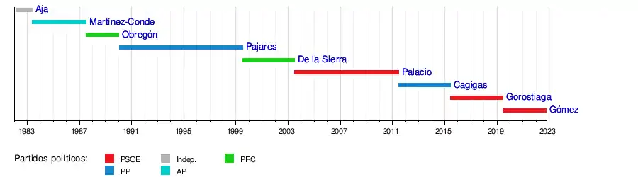 Desde que se aprobó el Estatuto de Autonomía, el Parlamento ha tenido nueve presidentes: tres del PSC-PSOE, dos del PP, dos del PRC, un independiente y uno de AP.