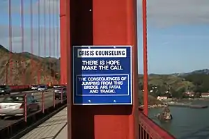 El suicidio es el acto de matarse deliberadamente o, más específicamente, un acto deliberadamente iniciado y realizado por la persona concernida en pleno conocimiento, o con la expectativa, de su fatal desenlace.[71] Al reconocer la necesidad de abordar ampliamente la prevención del suicidio, se han desarrollado varias estrategias apoyadas en evidencias científicas. El abordaje tradicional ha sido identificar los factores de riesgo que incrementan el riesgo de suicidio o autolesión, aunque el metaanálisis de estudios apunta a que la valoración del riesgo de suicidio puede no ser útil y recomienda la inmediata hospitalización de la persona con pensamientos suicidas como la opción más saludable.[72] En 2001 el Departamento de Salud y Servicios Sociales de los Estados Unidos, bajo la dirección del Cirujano General (General Surgeon), publicó la Estrategia Nacional de Prevención del Suicidio, que establecía un marco con esta finalidad en Estados Unidos. Este documento aboga por abordar la prevención del suicidio como una cuestión de salud pública, centrándose en identificar los patrones de suicidio e ideación suicida en grupos de población, en vez de examinar el historial y el estado de salud de individuos aislados.[73] La capacidad de reconocer señales de alarma permite a las personas preocupadas por alguien cercano dirigirlo a los servicios de ayuda.[4]
