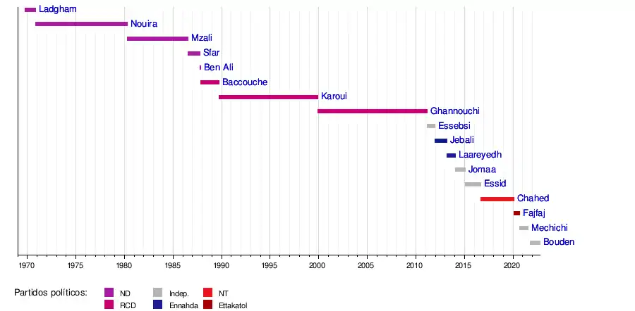 13 | ![]() | Mehdi Jomaa | 29 de enero de 2014 | 6 de febrero de 2015 | Sin partido (Coalición con Ennahda) | |||