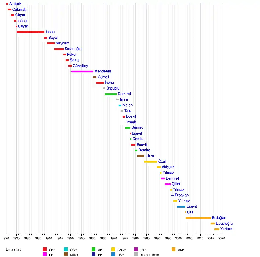 Nota: los gobiernos turcos se han conformado frecuentemente por coaliciones y en tales casos el partido político del primer ministro es citado.