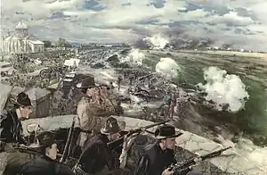 A las 4 p. m. del 10 de febrero, después de tres horas de bombardeo preparatorio por la batería de Utah de la 6ª artillería y fuego naval del USS Charleston y el USS Monadnock, la 1.ª brigada de MacArthur bajo el general Harrison G. Otis comenzó el ataque terrestre y abatió a las fuerzas filipinas defensoras.[2]: 57 Después de una lucha corta y cruel en la iglesia de la ciudad,[2]: 57 las fuerzas filipinas se retiraron hacia Malolos, la capital de la Primera República Filipina.