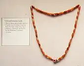 - British Museum notice: "Gold and carnelians beads. The two beads etched with patterns in white were probably imported from the Indus Valley. Fueron hechos por una técnica desarrollada por la civilización Harappa Fotografía del collar en cuestión