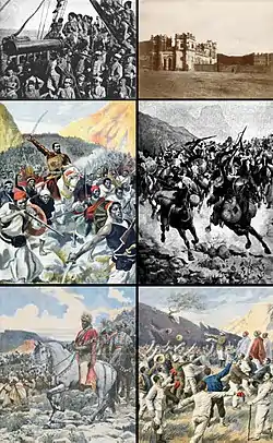 ![]() En el sentido de las manecillas del reloj: Soldados italianos hacia Massawa; castillo de Yohannes IV en Mekele; Caballería etíope en la batalla de Adua; Prisioneros italianos liberados al final de las hostilidades; Menelik II en Adua; Ras Makonnen liderando las tropas etíopes en la Batalla de Amba Alagi. | ||||