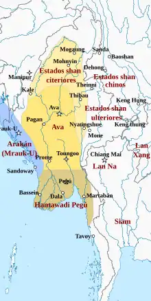 - El rey Thado Minbya de Ava reunificó la Birmania central entre 1364 y 1367. El rey Razadarit de Pegu hizo lo propio con las tres provincias mon de la Baja Birmanias en 1388-89.