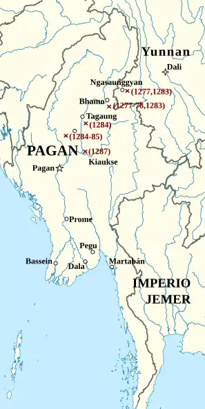 El Imperio mongol alcanzó las fronteras del reino de Pagan en 1252 tras invadir el reino vecino de Dali como parte del plan para cercar a la dinastía china de los Song. Los mongoles se apoderaron de la capital homónima del reino el 7 de enero de 1253 y pasaron los cuatro años siguientes sometiendo el resto del territorio.[6]