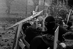![]() Integrantes de la Primera Línea en una manifestación en Santiago el 14 de noviembre de 2019. | ||