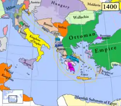 ![]() Mediterráneo oriental hacia 1400 | |||||||||||||||||||||||||||||||