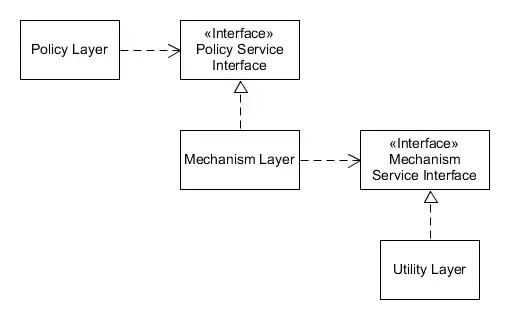 En una aplicación directa de inversión de dependencia, los resúmenes son propiedad de las capas superiores / políticas. Esta arquitectura agrupa los componentes superiores / de política y las abstracciones que definen los servicios inferiores juntos en el mismo paquete. Las capas de nivel inferior se crean por herencia / implementación de estas clases o interfaces abstractas. [1]