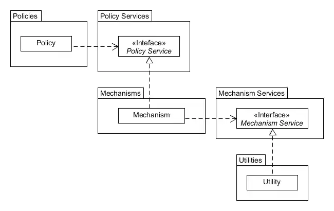 Una implementación directa empaqueta las clases de políticas con clases de resúmenes de servicio en una biblioteca. En esta implementación, los componentes de alto nivel y los componentes de bajo nivel se distribuyen en paquetes / bibliotecas separadas, donde las interfaces que definen el comportamiento / servicios requeridos por el componente de alto nivel son propiedad y existen dentro de la biblioteca del componente de alto nivel. La implementación de la interfaz del componente de alto nivel por parte del componente de bajo nivel requiere que el paquete de componentes de bajo nivel dependa del componente de alto nivel para la compilación, invirtiendo así la relación de dependencia convencional.