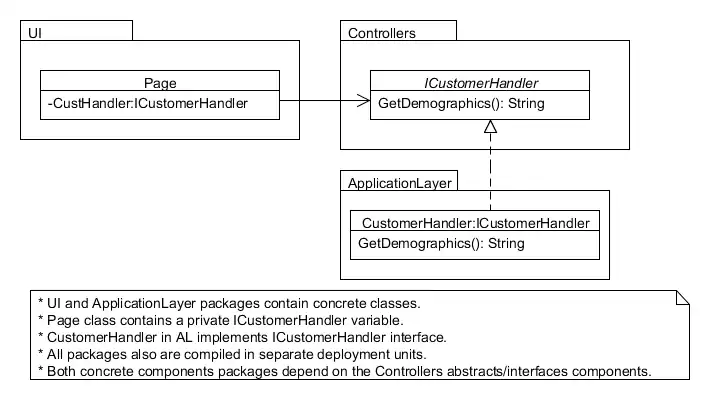 Los paquetes UI y ApplicationLayer contienen principalmente clases concretas. Los controladores contienen resúmenes/tipos de interfaz. La interfaz de usuario tiene una instancia de ICustomerHandler. Todos los paquetes están físicamente separados. En ApplicationLayer hay una implementación concreta que utilizará la clase Page. Las instancias de esta interfaz son creadas dinámicamente por una Fábrica (posiblemente en el mismo paquete de Controladores). Los tipos concretos, Page y CustomerHandler, no dependen el uno del otro; ambos dependen de ICustomerHandler.