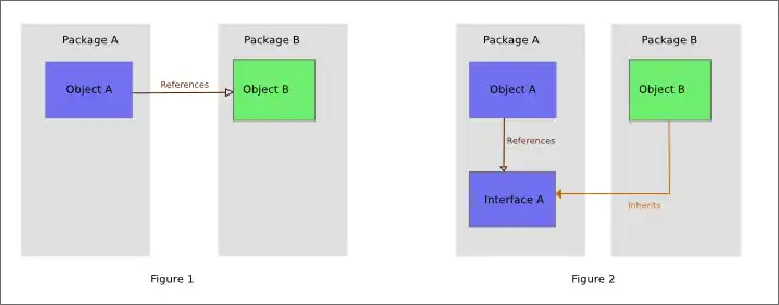 Las Figuras 1 y 2 ilustran el código con la misma funcionalidad, sin embargo, en la Figura 2, se ha utilizado una interfaz para invertir la dependencia. La dirección de dependencia se puede elegir para maximizar la reutilización del código de política y eliminar las dependencias cíclicas.