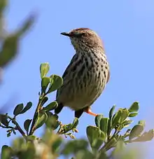 The Karoo prinia is usually seen in pairs or small groups, typically low in scrub, but sometimes perching on the top of a bush. It actively forages for small insects, with tail cocked and frequently swung side-to-side.