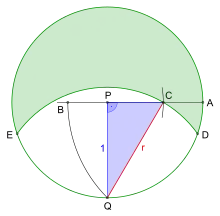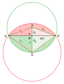 Para determinar el área delimitada por los dos arcos, esta se divide en dos segmentos circulares, que comparten la recta divisoria que pasa por las intersecciones y de las dos circunferencias. es el radio del círculo que representa el prado, y es el radio del círculo cuyo centro se encuentra en el borde del otro círculo, siendo (=) la distancia entre los dos centros de los círculos y a los que se ha hecho referencia.