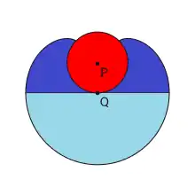 En este caso, la superficie a la que puede acceder la cabra consiste en un semicírculo (azul claro) con un radio y dos áreas delimitadas por el círculo rojo y la evoluta del círculo (azul oscuro). El contenido de una de las áreas azul oscuro se deriva de la fórmula del sector Leibniz. El área total accesible (azul claro y azul oscuro) es entonces