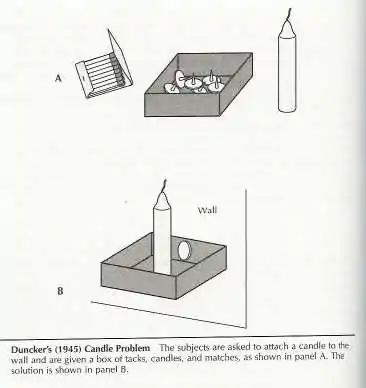 La solución es vaciar la caja de chinches, usar uno para clavar la caja a la pared, poner la vela en la caja y encender la vela con los fósforos.[3] El concepto de ón funcional predice que el participante solo observará la caja como un elemento para guardar los chinches y no la considerara de inmediato como un elemento separado, funcional y disponible para solucionar la tarea.