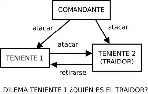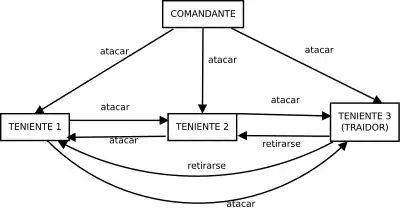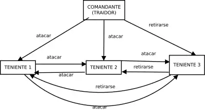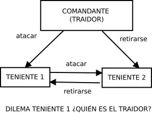 - Supongamos que el comandante es un traidor. Si el comandante envía una orden distinta a cada teniente entonces habrá un teniente que no sepa qué acción realizar: