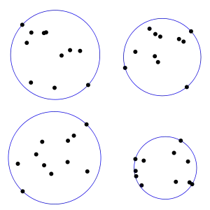 algorithm welzl:[8] input: Finite sets P and R of points in the plane output: Minimal disk enclosing P with R on the boundary, or undefined if no such disk exists if P is empty or |R| ≥ 3: if |R| = 1: (we do this to support multisets with duplicate points) (we assume that a circle with a radius of zero can exist) p := R[0] return circle(p, 0) else if |R| = 2: (we do this to support multisets with duplicate points) (we use that the smallest circle between two points has a center at their midpoint) (and the segment that passes through them is a diameter of the circle) p0 := R[0] p1 := R[1] center := midpoint(p0, p1) diameter := distance(p0, p1) return circle(center, diameter / 2) else if the points of R are cocircular: return the ball they determine else: return undefined choose p in P (randomly and uniformly) D := welzl(P - { p }, R) if p is in D: return D return welzl(P - { p }, R ∪ { p })