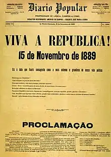 La Proclamación de la República Brasileña fue un golpe militar ocurrido el 15 de noviembre de 1889 que instauró la forma republicana federal presidencialista, derrumbando la monarquía parlamentaria del Imperio de Brasil y, en consecuencia, poniendo fin al reinado del emperador Pedro II de Brasil. Fue, entonces, proclamada la República de Brasil.