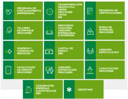 - Formación al exportador[6]: PROCOMER ofrece una serie de capacitaciones orientadas a asesorar y actualizar los conocimientos para incentivar la exportación de sus bienes o servicios, ya sea de forma directa o a través de encadenamientos, de manera que sus negocios en los mercados internacionales se concreten.