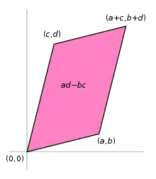 son un par de vectores dados en R2, escritos en componentes. Hay un paralelogramo único que tiene v y w como dos de sus lados. El área de este paralelogramo viene dada por la fórmula estándar del determinante: