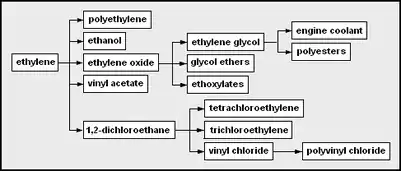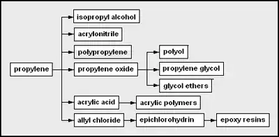 Materia prima básica Benceno Butadieno Etileno p -Xileno Propileno Intermedios 2-etilhexanol (2-EH) Acrilonitrilo (AN) Ftalato de bis (2-etilhexilo) (ftalato de dioctilo) n- Buteno Tereftalato de dimetilo (DMT) Dodecilbenceno Etoxilato 1,2-dicloroetano (dicloruro de etileno o EDC) Etilenglicol (EG) Óxido de etileno (EO) Compuesto de moldeo de formaldehído (FMC) n- hexeno Alquil benceno lineal (LAB) Metil terc butil éter (MTBE) Óxido de propileno Ácido tereftálico purificado (PTA) Monómero de estireno (SM) Resina termoestable (urea / melamina) |