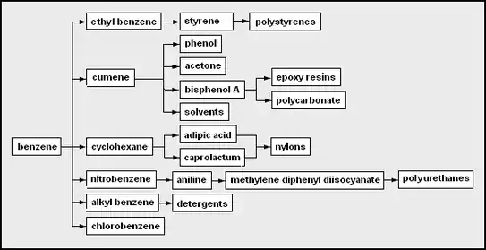- benceno - el hidrocarburo aromático más simple.Productos químicos producidos a partir de benceno