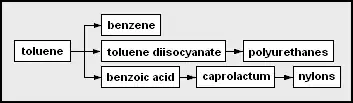 - Los aromáticos incluyen benceno, tolueno y xilenos, en su totalidad denominados BTX y principalmente obtenidos de refinerías de petróleo por extracción del reformado producido en reformadores catalíticos utilizando nafta obtenida de refinerías de petróleo. El benceno es una materia prima para los tintes y detergentes sintéticos, y el benceno y el tolueno para los isocianatos MDI y TDI utilizados en la fabricación de poliuretanos. Los fabricantes utilizan xilenos para producir plásticos y fibras sintéticas.