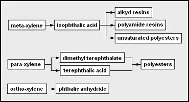 - σ-xileno: ambos grupos metilo pueden oxidarse para formar ácido (orto) ftálico