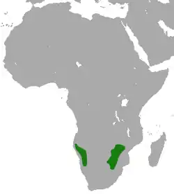 Su distribución se limita al sur de África, en dos zonas separadas: la zona del este se extiende desde Zambia y Zimbabue hasta el oeste de Mozambique; la zona más oriental cubre desde el suroeste de Angola hasta el centro de Namibia.