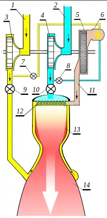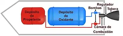 Para los cohetes de propulsores líquidos, existen cuatro formas diferentes usuales de alimentar la inyección del propelente en la cámara de combustión.[12]