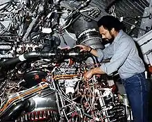 [4]-Instalación del motor North American Rockwell, Rocketdyne F-1. Los 5 motores están instalados en la primera etapa de la nave espacial "Saturno V". Estos motores impulsaron el vuelo del hombre a la Luna. Empuje: 691 tons (1967)