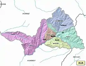 La nueva provincia se creó conformada por 9 distritos. Entre los 5 distritos ya existentes estaban el Distrito de Aija, el Distrito de Succha, el Distrito de Huayán, el Distrito de Coris y el Distrito de Malvas. Y entre los 4 nuevos distritos que se crearon, con dicha ley, estaban el Distrito de Huacllán, que era anexo de Succha; el Distrito de La Merced, que era anexo de Aija; el Distrito de Tapacocha, que pertenecía al Distrito de Cotaparaco; y el Distrito de Cochapeti, que era anexo de Malvas.