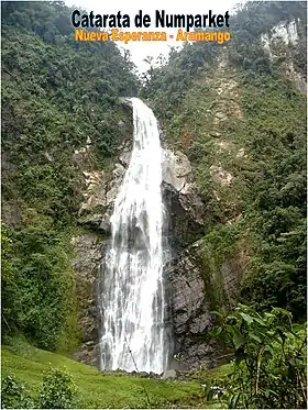 - Catarata de Numparquet (Aramango): Consiste en una caída de agua de aproximadamente 120 metros de altura, encerrado en la confluencia de dos farallones rocosos, formado por las aguas que discurren en las alturas de los orígenes de la quebrada de Aramango, desde el caserío de Nueva Esperanza, se tiene que caminar alrededor de 3 horas hasta llegar a la caída; en el recorrido se puede apreciar una gran variedad de flora, propia de la selva alta, como Cedro, Caoba, Menta; orquídeas pintorescas, Bromelias, Hongos comestibles; además de fauna abundante, como momos, choscas, otorongos y siendo el más representativo el gallitos de las rocas.