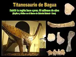 En la Era Secundaria o Mesozoica en Bagua habitaba el dinosaurio Titanosaurio; era un saurópodo, es decir vegetariano. Se alimentaba de la floresta que crecía en las riberas del desaparecido litoral. Los titanosaurios eran ovíparos, acostumbraban a andar en manada protegiendo a sus crías, poseían un cuello largo y cola delgada, dentición reducida y unos escudos óseos en la en su cuerpo.[9]