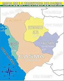 La ciudad de Casma es la capital de la provincia Casmeña. Se encuentra ubicado en el Distrito de Casma.