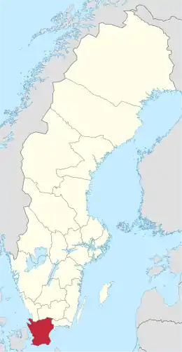 Limita al oeste con el Öresund, al norte con las provincias de Halland y Småland, al noreste con Blekinge y al sur y al este con el mar Báltico.