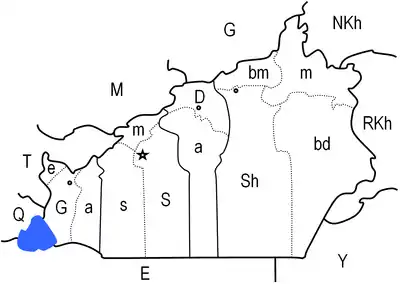 Provincias vecinas: E: Isfahán, G: Golestán, M: Mazandarán, NKh: Jorasán del Norte, Q: Qom, RKh: Jorasán Razavi, T: Teherán, Y: Yazd |