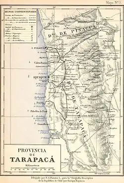 ![]() Mapa de la provincia chilena de Tarapacá, hacia 1895. | ||||||||||||||||||||||||||||||||||||||