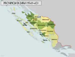 La ciudad de Zara también incluyó sus alrededores, hasta aquel momento yugoslavo, más las islas frente a Zara que pasaron a estar bajo soberanía italiana, para devenir como parte de la Gobernación de Dalmacia que fue instituida según el Real Decreto Ley n°452 del 18 de mayo de 1941 y establecido por el Real Decreto Ley 453 del 7 de junio de 1941. Dentro de la misma gobernación, sin embargo, las islas de Cazza, Lasgosta y Pelagosa pasaron a la nueva provincia de Spalato, y Saseno a la de Cattaro.[4]