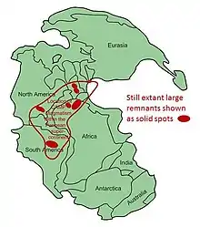 Situación de la provincia magmática del Atlántico Central sobre una reconstrucción de Pangea.