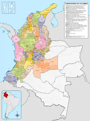 Dentro de esta organización territorial, existen otro tipo de división intermedia entre departamento y municipio que recibe el nombre de provincia/subregión;[2][nota 1] sin embargo esta división no es político-administrativa, ya que no poseen mecanismos de gobierno propio: sirven para propósitos de recolección de información, la supervigilancia de los proyectos en común en estos territorios y, en ciertos departamentos, se mantiene su vigencia para la zonificación y administración de algunos servicios públicos; además, llegado al caso por parte de las asambleas departamentales, se les pueden delegar ciertas atribuciones de la gobernación departamental a estas. Son inexistentes en los departamentos amazónicos y de los Llanos orientales (exceptuando, El Meta).[1]
