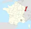 Alsacia | Provincia | Estrasburgo, parlamento en Colmar | Creado a partir del Landgraviato de la Alta Alsacia (anexado por Francia en 1648). |