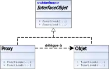 Un proxy, en su forma más general, es una clase que funciona como una interfaz para otra cosa. El proxy podría interactuar con cualquier cosa: una conexión de red, un objeto grande en la memoria, un archivo o algún otro recurso que sea costoso o imposible de duplicar. En resumen, un proxy es un contenedor o un objeto de agente que el cliente está llamando para acceder al objeto de servicio real detrás de escena. El uso del proxy puede ser simplemente reenvío al objeto real, o puede proporcionar lógica adicional. En el proxy, se puede proporcionar una funcionalidad adicional, por ejemplo, el almacenamiento en caché cuando las operaciones en el objeto real requieren muchos recursos, o la comprobación de las condiciones previas antes de que se invoquen las operaciones en el objeto real. Para el cliente, el uso de un objeto proxy es similar al uso del objeto real, porque ambos implementan la misma interfaz.[1]