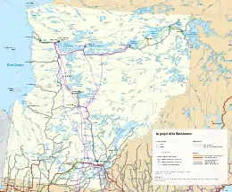 Desde la fase de construcción inicial en los años setenta, el proyecto de la bahía de James ha creado una compleja cadena de embalses al integrar todas las cuencas de la ribera oriental de la bahía de Hudson, desde la punta meridional de la bahía de James, a la bahía de Ungava, en el norte, desviando el curso del agua de alrededor de cuatro grandes ríos hacia un gran cuerpo hídrico, al final cambiando la dinámica de la tierra, un fenómeno de política ambiental a menudo considerado una política de «primero construye, luego píntalo de verde».[2]
