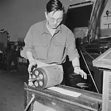 Bill Hosokawa haciendo una tirada de una prueba de galera mientras trabajaba como editor de diario en el Heart Mountain concentration camp, 1943