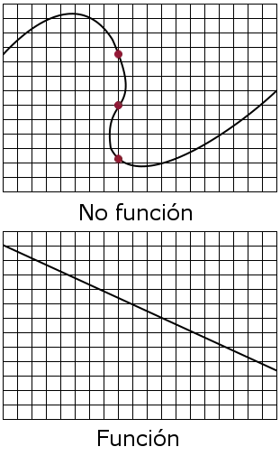 Para usar la prueba de la línea vertical, se utiliza una regla y se dibuja una línea paralela al eje y para cualquier valor elegido de x. Si la línea vertical trazada interseca el gráfico más de una vez para algún valor de x, entonces el gráfico no es el gráfico de una función. Si, alternativamente, una línea vertical interseca el gráfico no más de una vez, no importa dónde se coloque la línea vertical, entonces la curva es el gráfico de una función. Por ejemplo, una curva que sea cualquier línea recta que no sea una línea vertical será la gráfica de una función. Otro ejemplo, una parábola lateral (una cuyo directriz es una línea vertical) no es el gráfico de una función porque algunas líneas verticales se cruzan con la parábola dos veces.