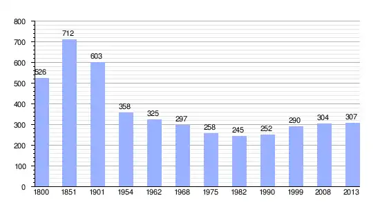 Los datos demográficos contemplados en este gráfico de la comuna de Prunoy[4] se han cogido de 1800 a 1999 de la página francesa EHESS/Cassini, y los demás datos de la página del INSEE.[5]
