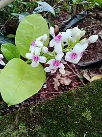 Esta especie tiene hojas de color amarillo cremoso con verde. Las pequeñas flores blancas tienen manchas de color rosa púrpura que se concentran en la base de los pétalos.[2]