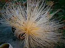 Las flores se presentan solitarias o en cimas de 2 a 5 flores; alcanzan los 10 cm, y se abren por la noche. Los pétalos son lanceolados, pubescentes, carnosos, de 7 a 9 cm de longitud y color rosado o crema; los estambres son numerosísimos, formando bolas blancas con apariencia de pompones. El estigma es normalmente lobulado, a veces capitado; el ovario súpero. La polinización es zoofílica, realizada frecuentemente por murciélagos herbívoros, que se nutren de los pétalos. Hacia comienzos de la estación seca forman frutos en cápsulas dehiscentes, pentavalvas, leñosas, conteniendo numerosas semillas envueltas en filamentos algodonados de color blancogrisáceo que ayudan a su dispersión por anemocoria.