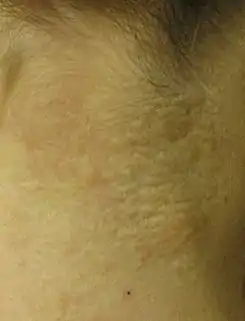 - Piel. Aparecen una serie de manchas, en realidad máculas y pápulas de entre 1 y 4 mm de diámetro que confluyen en placas más grandes y le dan a la piel de ciertas zonas un aspecto característico y una consistencia flácida, laxa y arrugada.